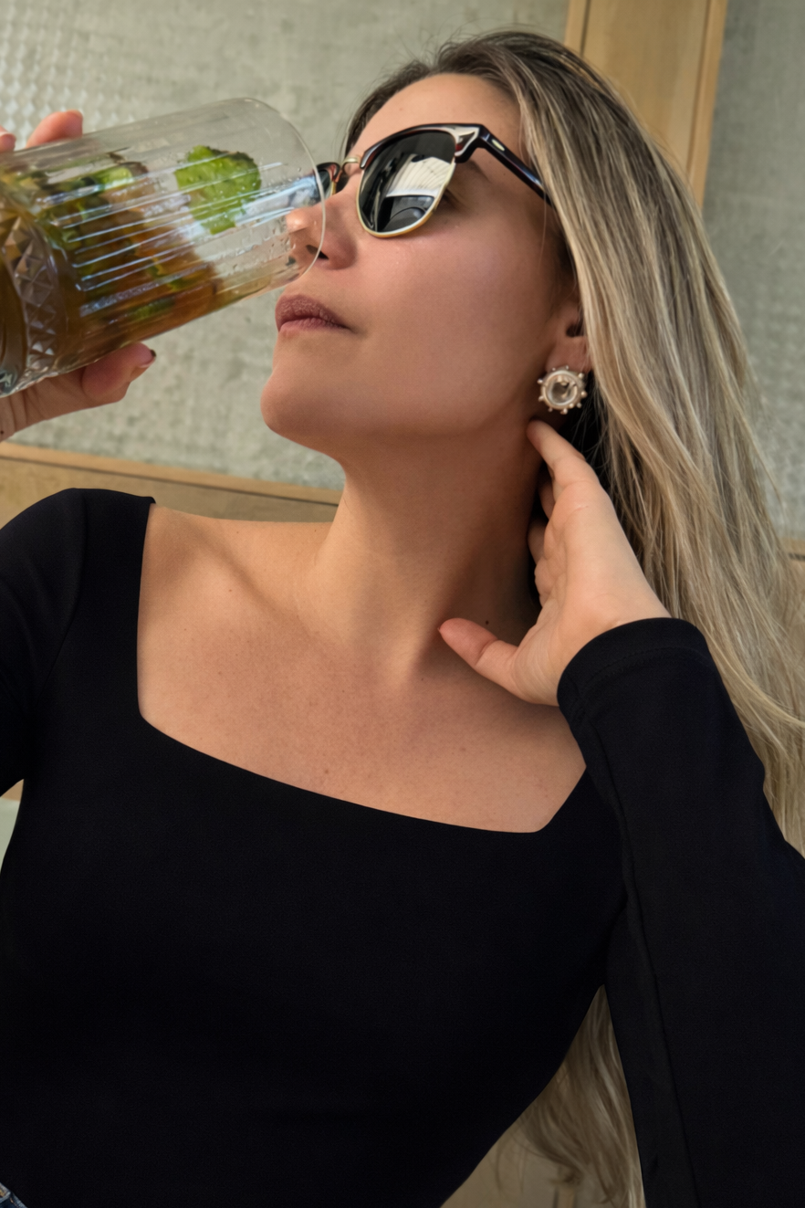 Un body que equilibra atemporalidad y sensualidad con absoluta elegancia. Su escote frontal recto enmarca clavículas y hombros con una línea limpia y sofisticada, mientras la espalda profunda en V se convierte en el verdadero protagonista del diseño.